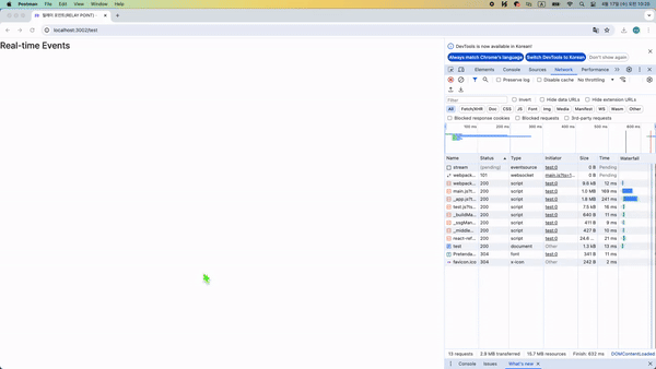 その後、サーバーから継続的にデータを送ると、クライアント(ウェブブラウザ)で別途のリクエストなしでリアルタイムでデータを受信することが確認できます。